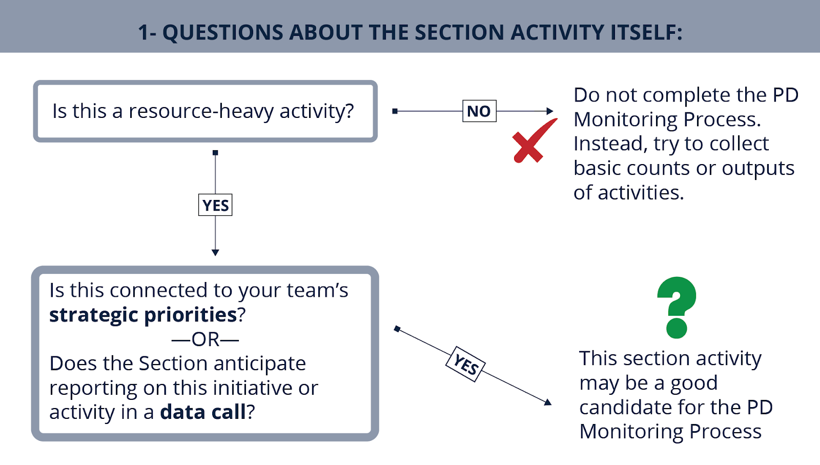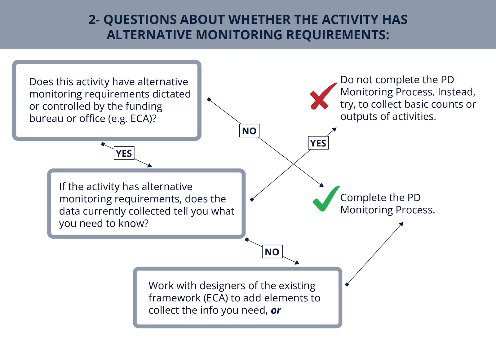 PD sections cannot monitor everything, and it would be inefficient to attempt to do so. Instead, determine what your section will monitor by considering how closely it aligns with your team’s strategic priorities, whether it is relatively resource-intensive, the likelihood of it being included in a data call, and the extent to which it is already covered by other monitoring requirements (e.g., those funded by bureaus such as ECA or DRL). Figures 11 and 12 provide guidance on the questions you can work through with your team when deciding on whether an activity is a good candidate for the PD Monitoring Process.